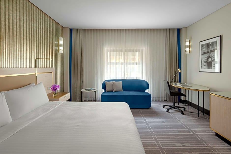 The Paradox Executive Suite’s open floor plan features street-facing views and a cozy seating area, creating a versatile command center for hosting clients, brainstorming with colleagues, or toasting to success. When it is time to log off, step down into the sunken bedroom, where a king bed offers a first-class sleep experience, and the private bathroom steals the show with a freestanding tub. Your stay includes complimentary access to the Business Class Lounge, where daily breakfast, afternoon snacks, and evening cocktails with canapés keep you refreshed, refueled, and ready for what is next. Extra people charged at entry to lounge.