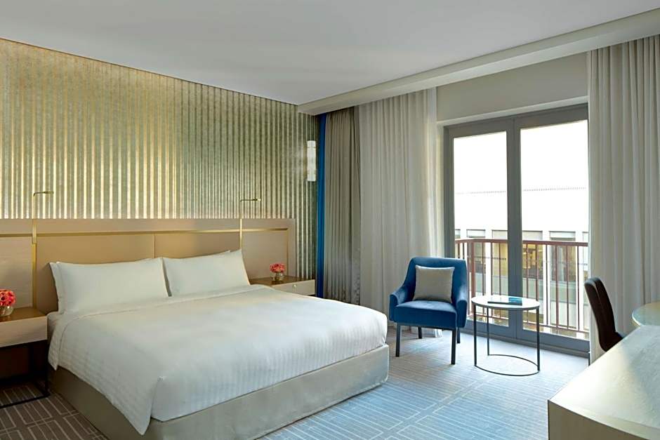 An Atrium facing room with a Queen Bed. Each room is crafted for comfort and clarity. Calming tones of blue and gray set a serene backdrop, while cloud-soft bedding and a curated pillow menu ensure your rest is just the way you like it. Whether you are here to work, explore, or do absolutely nothing at all, your room keeps up with you—complete with high-speed Wi-Fi, a smart TV, and mini-bar on demand. All rooms feature an ensuite marble bathroom with a vanity. Most include a separate shower and extra-deep European-style bath, while some of the Atrium facing rooms are fitted with a walk-in shower only. Surcharge applies for 3rd adult and all extra beds.